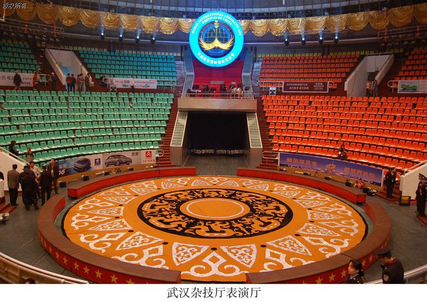 圆形的主楼象一朵盛开的菊花,以其独特的风格成为武汉市城市建筑中一颗耀眼的明珠。主厅内设观众座席近 3000个,彩色玻璃钢座椅美观舒适,以绿、黄、蓝、红四色为分区标志。环型大棚采用铝合金吸音孔板。圆型舞台直径17.8米,面积255平方米,表演空间高达21米,是标准的杂技马戏演出场地。演出厅外环是上下两层的休息厅,使用面积2000平方米,设有贵宾休息室。与主楼相连的附楼,设有演员候场间、道具间、高级化妆室,大小兽房、兽医房、训兽房等设施。